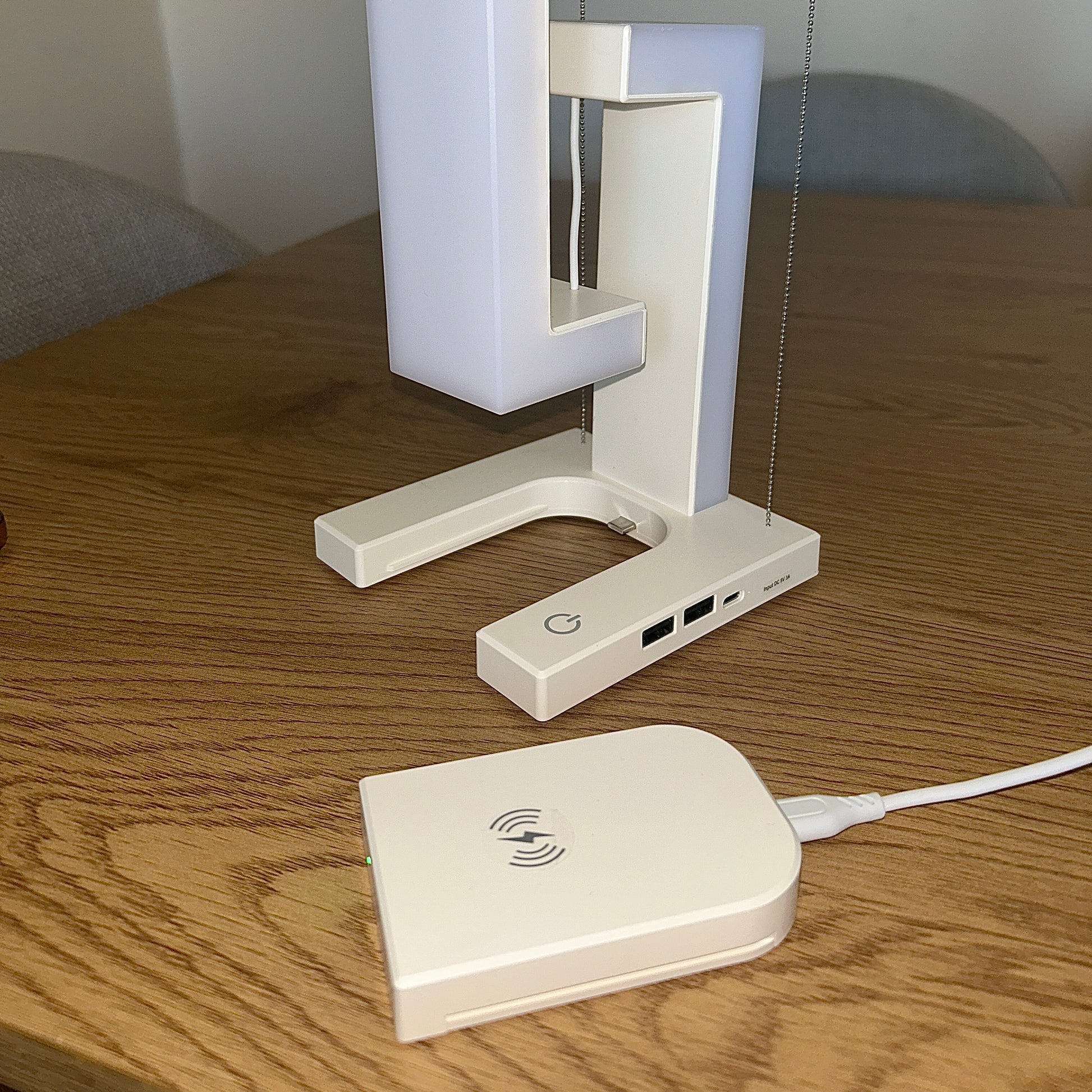 Nowoczesne oświetlenie + ładowanie telefonu w jednym miejscu zwiększają komfort pracy.
